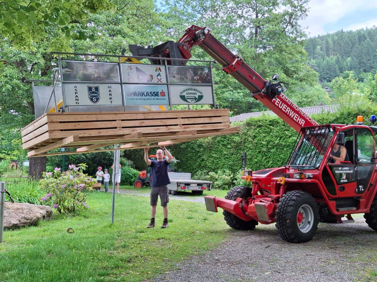 Auch das Floß am Teich ist zu erneuern gewesen, und die Arbeiten mit Hilfe der Mitarbeiter des Gemeindebauhofes befinden sich unmittelbar vor dem Abschluss. Damit steht dann den Kindern und allen, die es gerne ausprobieren wollen, nichts mehr im Wege, den Teich sicher zu befahren.